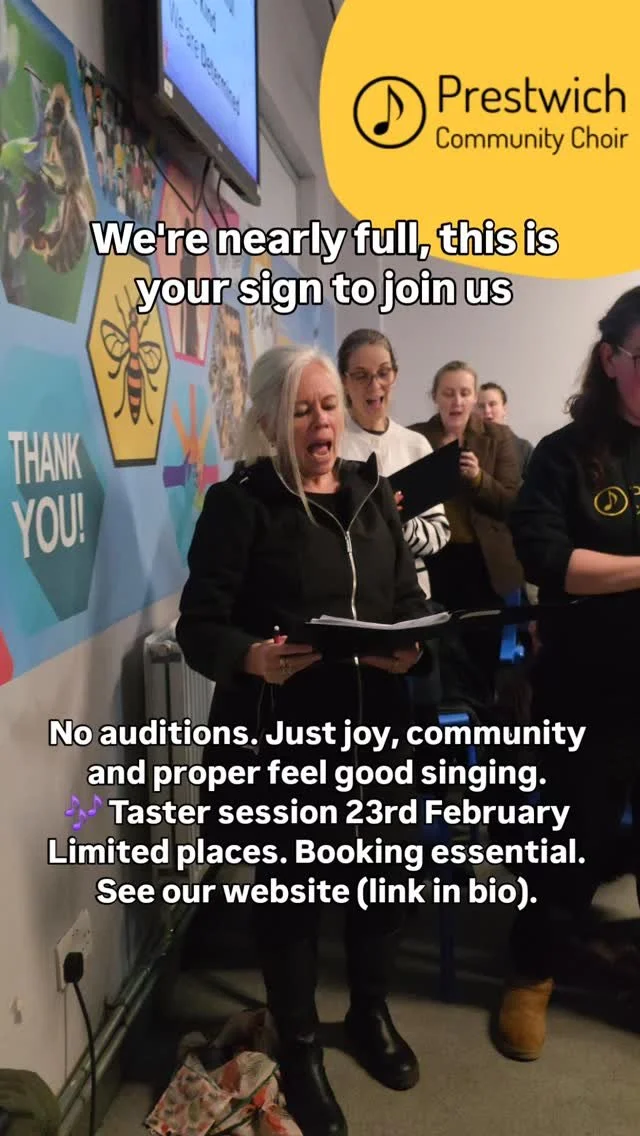 Prestwich Community Choir is a warm, welcoming space where real people come together to sing, laugh and feel good. No auditions. No pressure. No perfect voice required. Just uplifting contemporary songs, friendly faces and a weekly mood boost that lasts longer than your cup of tea. Our socials are lively, our rehearsals are joyful and our performances bring our community together, whilst raising funds for local causes.